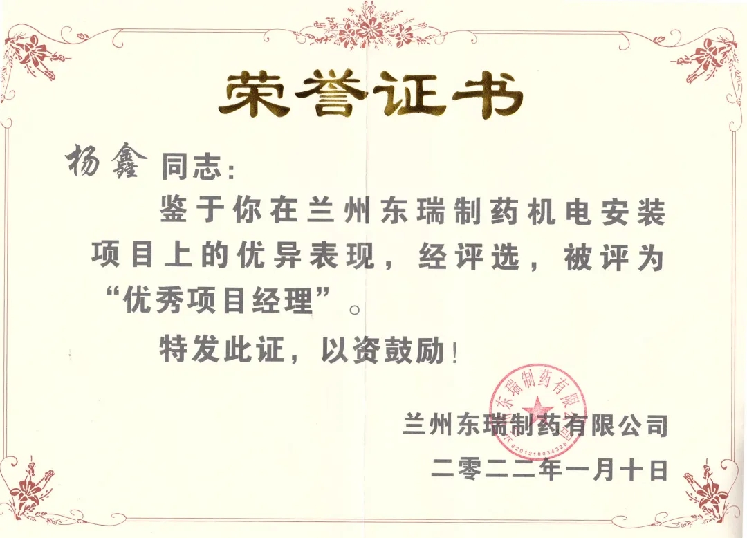 近日,從東瑞制藥(蘭州)原料藥基地建設項目部傳來喜訊,蘭州東瑞項目經理楊鑫同志被業主授予“優秀項目經理”榮譽稱號。 ...