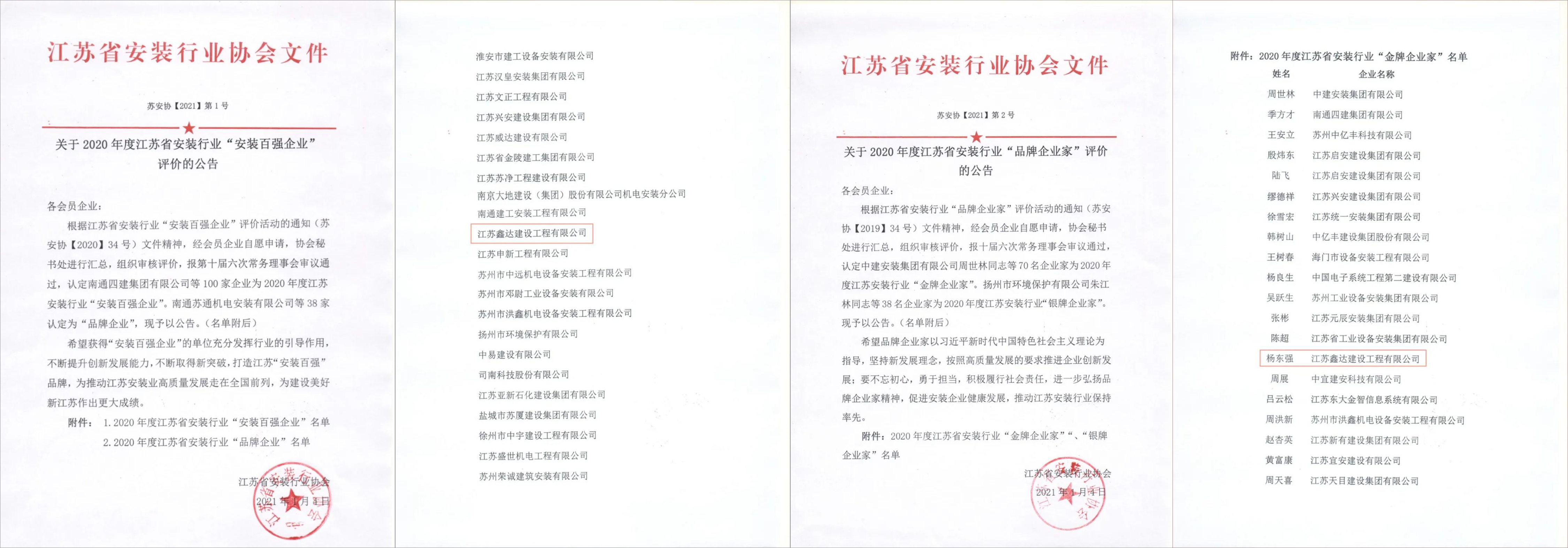 從江蘇省安裝行業協會獲悉,2020年度江蘇省安裝行業“安裝百強企業”及“品牌企業家”評選活動結果已經揭曉,全省共有138家單位及108位企業家獲獎,我司再次榮獲江蘇省安裝行業協會“安裝百強企業”稱號,總經理楊東強榮獲江蘇省安裝行業協會“金牌企業家”稱號。